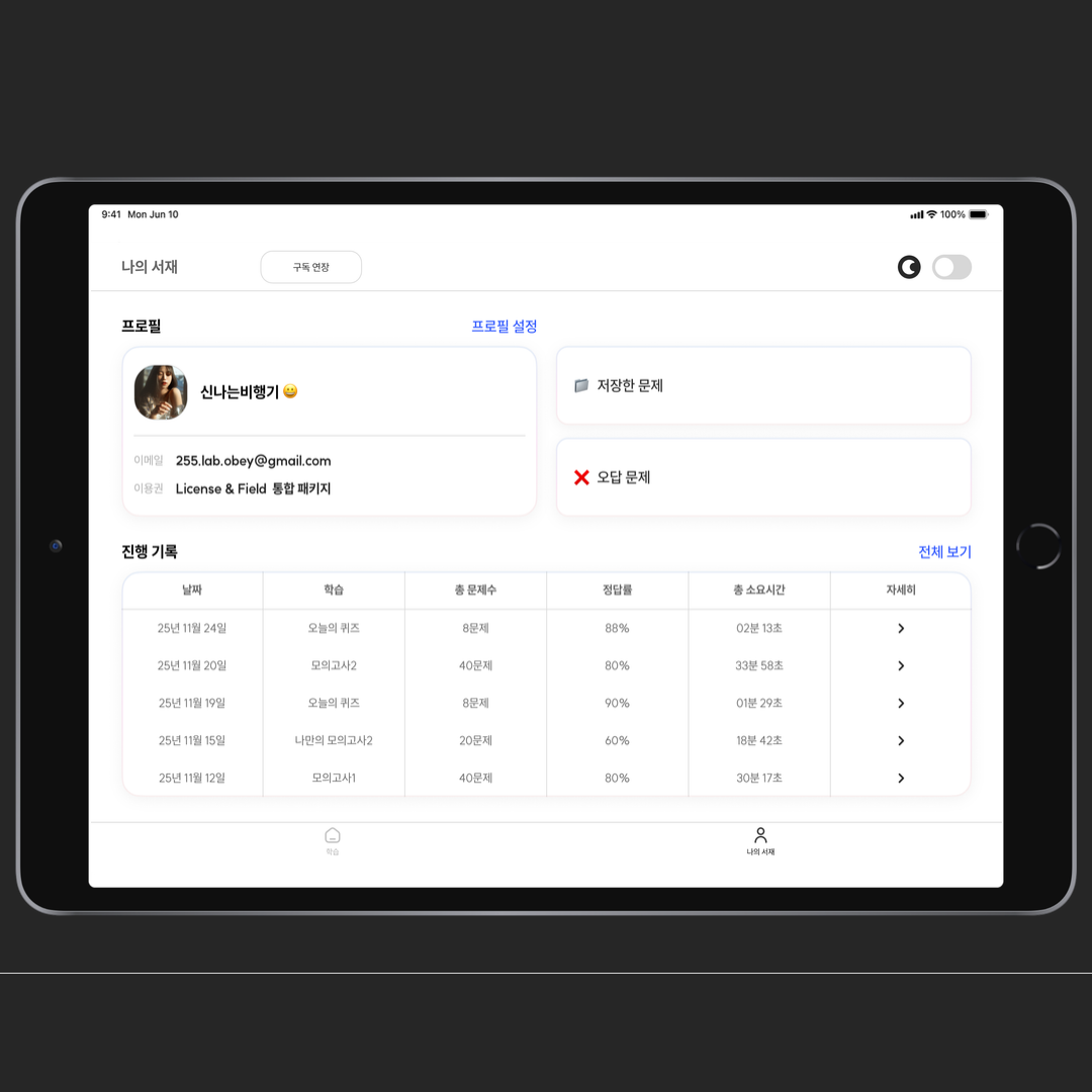 또한 번거로운 PC 환경이 아닌 태블릿 환경에 최적화된 시험 풀이 시스템을 지원하여더욱 편리하고 몰입도 높은 학습 경험을 제공하고 있습니다.
