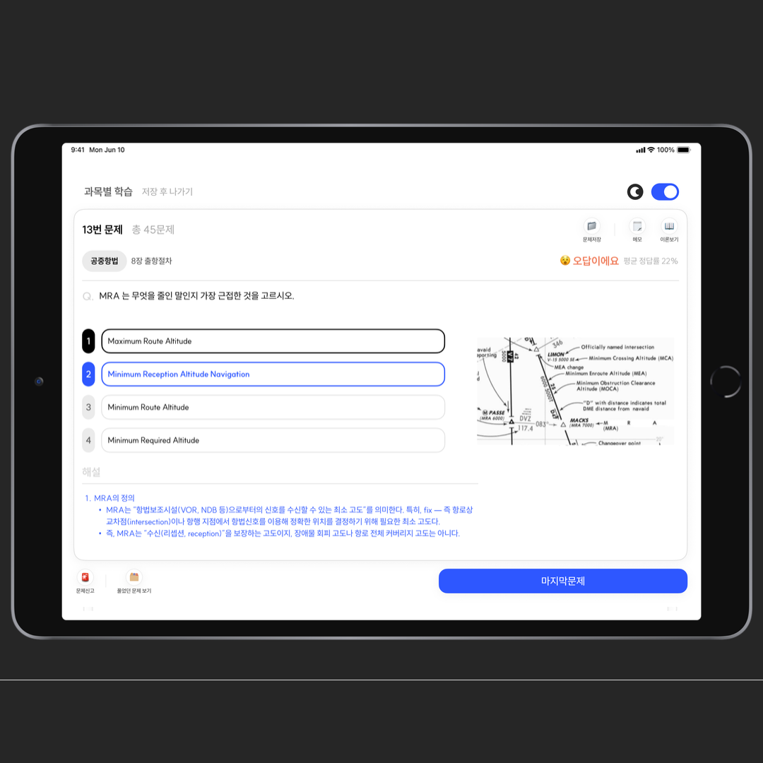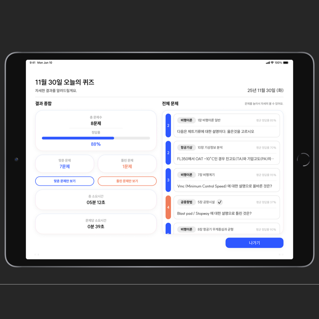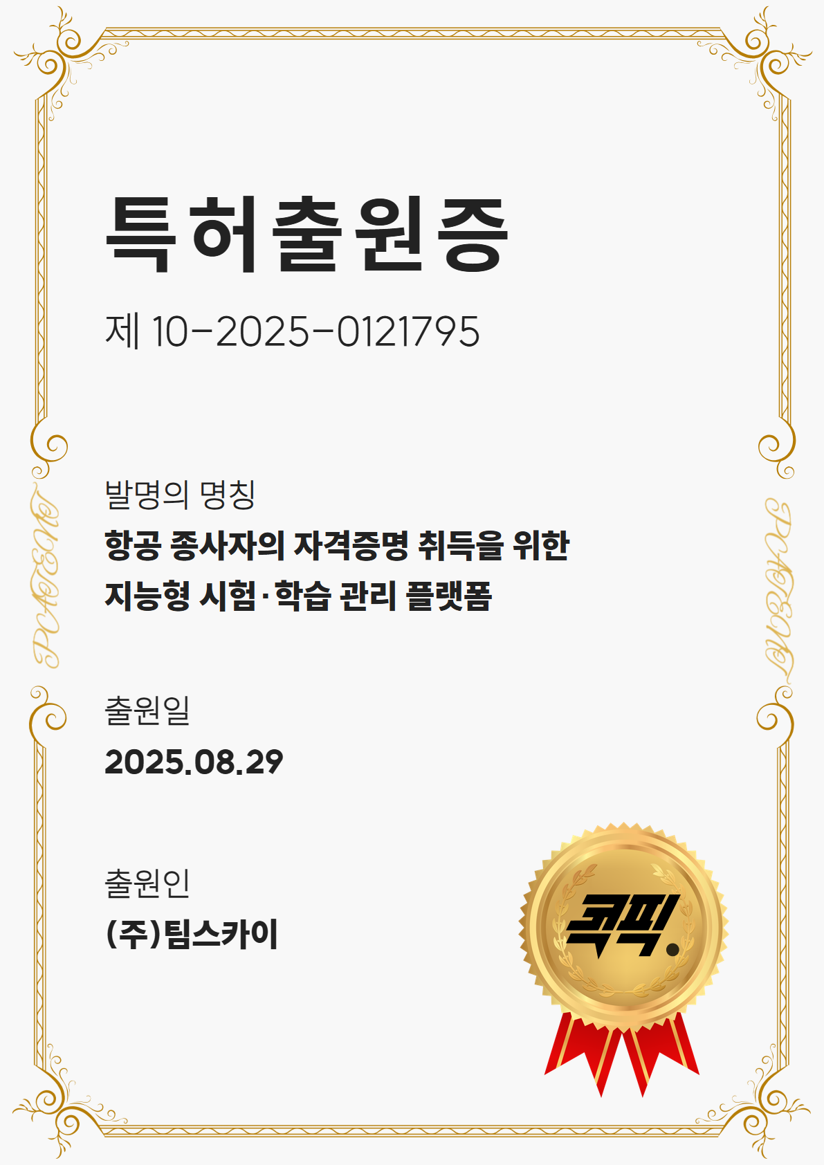 콕픽은 커뮤니티에서 공유되는 문제들과는 별도로,자체 문제 개발 시스템과 검증 시스템을 통해 고품질 문제를 제작하고 있습니다.그 결과, 실제 항공사 기출문제와 99.99% 수준으로 유사한 실전형 문제를 제공합니다.